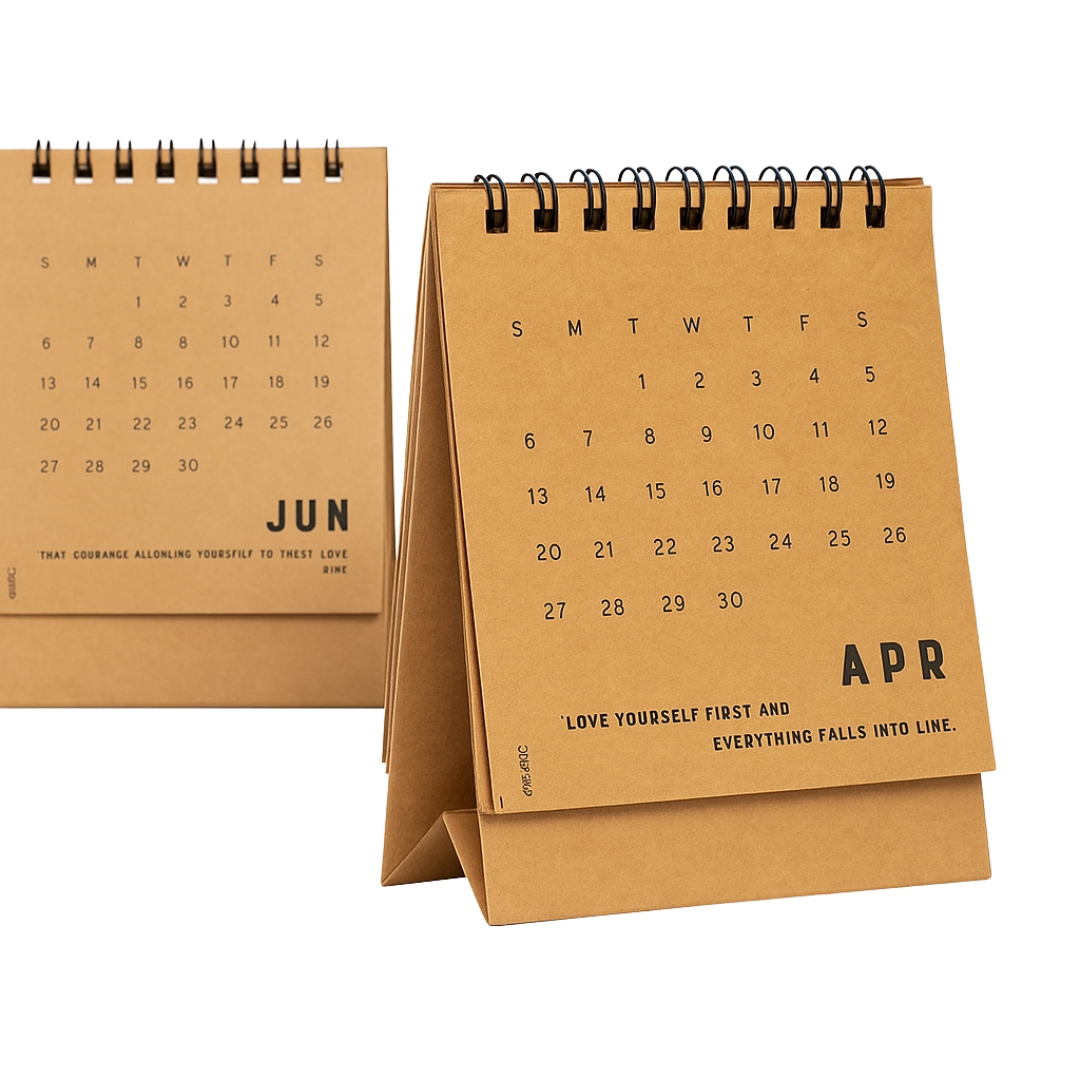 The Kraft Desk Calendar offers a clean, minimalist aesthetic combined with sustainable design. Crafted from eco-friendly kraft paper, its neutral tones and sturdy build make it an attractive and functional accessory for any workspace. With a compact standing format, it fits neatly on desks, reception counters, or study tables, making it ideal for daily date reference without taking up much space. The spiral-bound pages are easy to flip, ensuring effortless month-to-month navigation. Its eco-conscious materials reflect a commitment to environmental responsibility, making it a thoughtful choice for businesses that value sustainability. The natural brown finish complements both modern and rustic décor, blending seamlessly into professional or home environments.