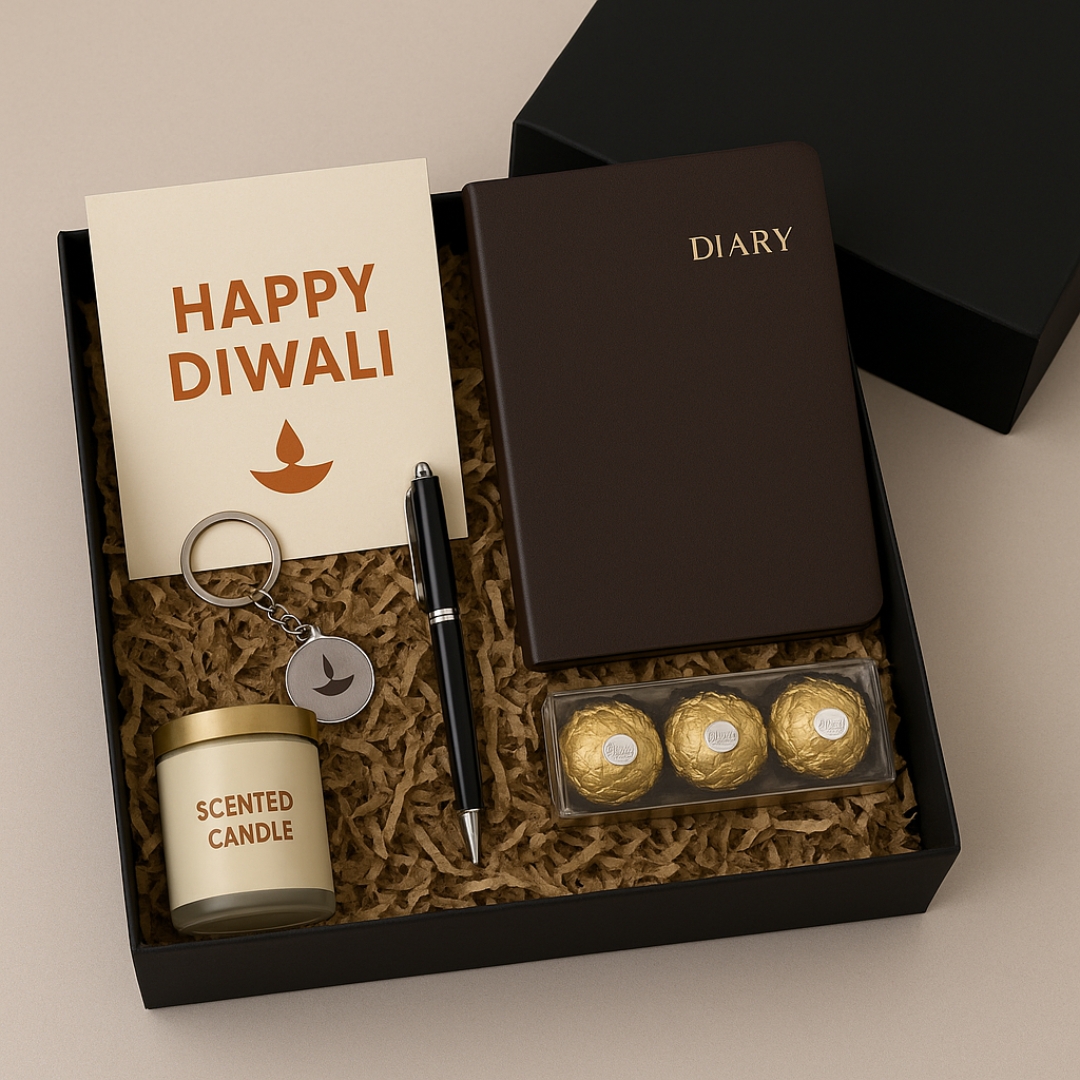 The Luxe Corporate Diwali Hamper combines sophistication with festive charm, making it an excellent gift for executives, clients, and partners. Presented in a sleek black box, it features a high-quality leatherette notebook, a premium ball pen, a scented candle, and rich chocolates to add sweetness to the occasion.